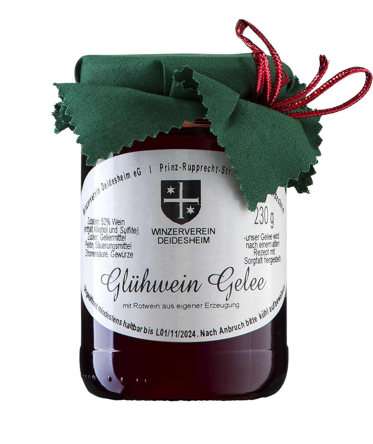 Zutaten: 52% Wein (enthält Alkohol und Sulfite). Zucker, Geliermittel Pektin, Säuerungsmittel Zitronensäure.